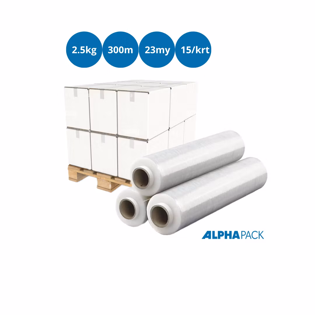 Hög Motståndskraft: Skydda dina varor mot oönskade yttre faktorer som fukt och smuts med vår robusta handsträckfilm. ALPHA-filmen utgör en pålitlig barriär som bevarar innehållet i optimalt skick, oavsett transportförhållanden.